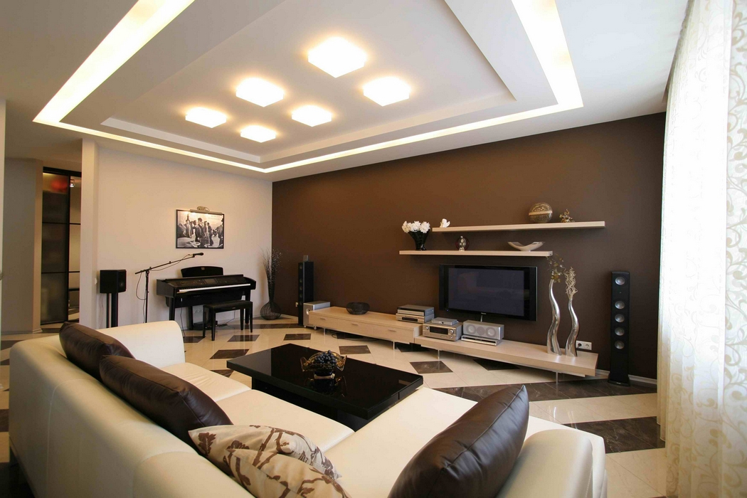 В комнатах несколько больших размеров, можно с использованием элементов подсветки, на основе светодиодов, выполнить их зонирование, а также осуществить подсветку потолков, выполненных на разных уровнях.