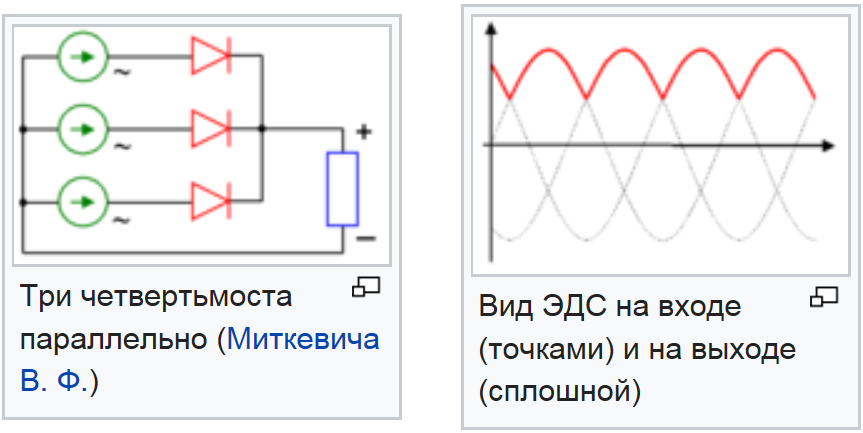 Устройства с тремя входящими фазами являются достаточно распространенными. Они обрезают часть волны, за счет чего значительно снижают колебания. Наиболее популярна трехдиодная схема Миткевича и шестидиодная схема Ларионова.