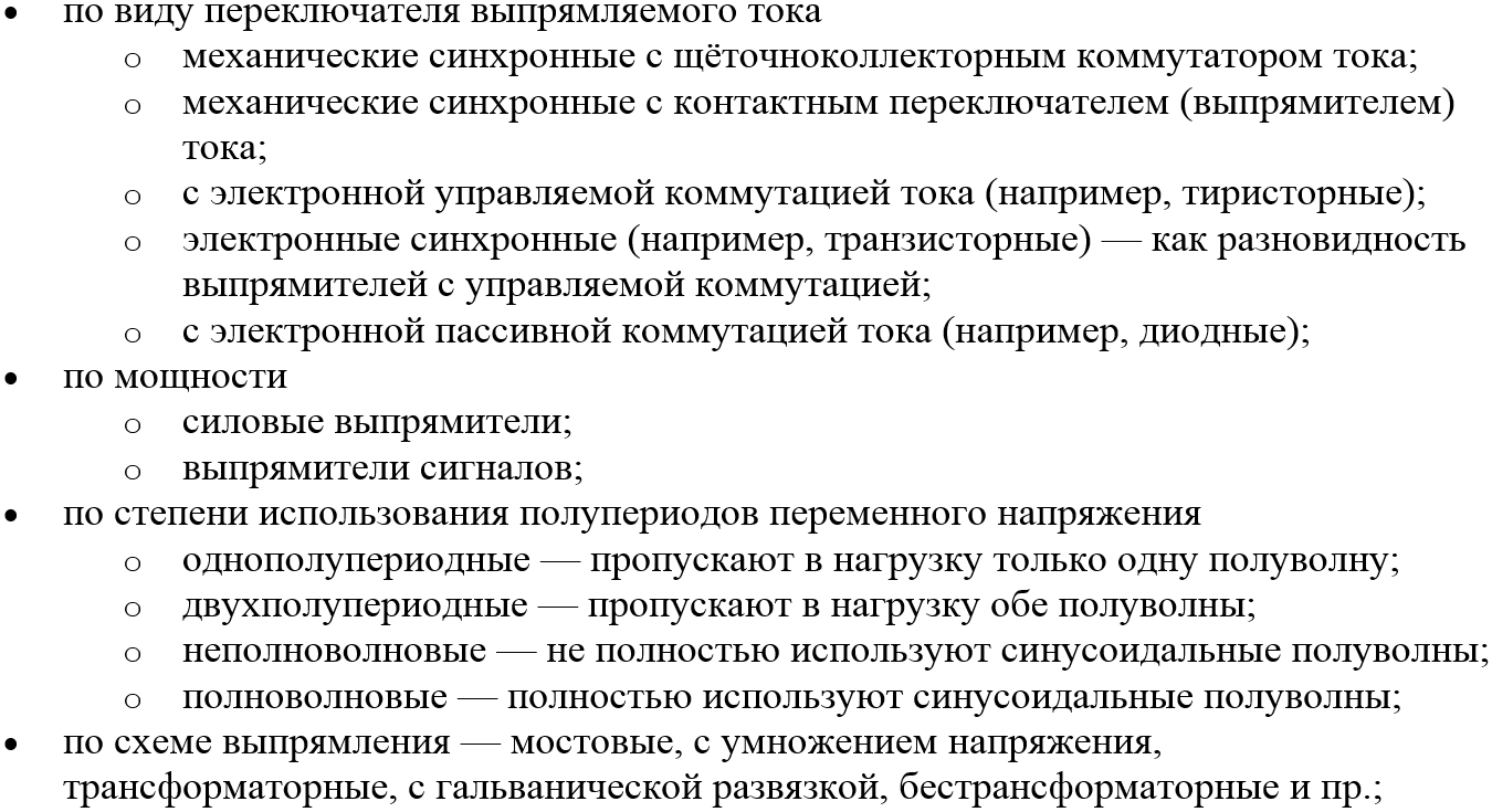 - Согласно типу устройства, пропускающего синусоиду, делят на полупроводниковые диодные и тиристорные, механические и вакуумные, ртутные;