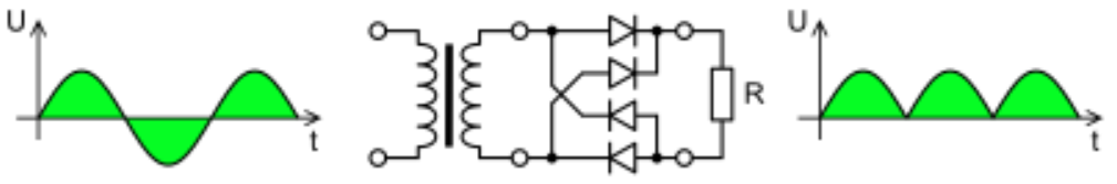 Переменный ток, имеющий определенную меняющуюся частоту, подается на входные контакты моста. На выходах с положительным и отрицательным значением образуется однополярный ток, обладающий повышенной пульсацией, значительно превышающей частоту тока, подаваемого на вход.