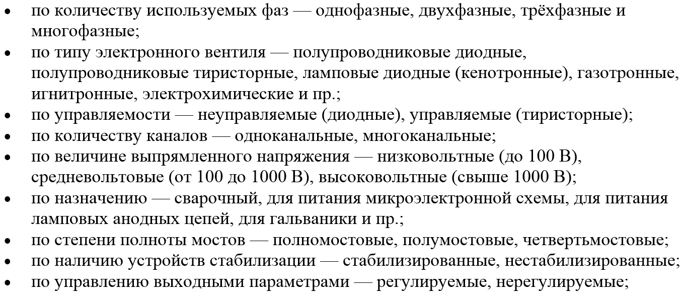 Выпрямители переменного тока разделяют на несколько различных видов, в зависимости от характеристик, использования периодов переменного тока, схем, по количеству фаз и типу пропускающего элемента. В общем виде классификация имеет следующий вид: