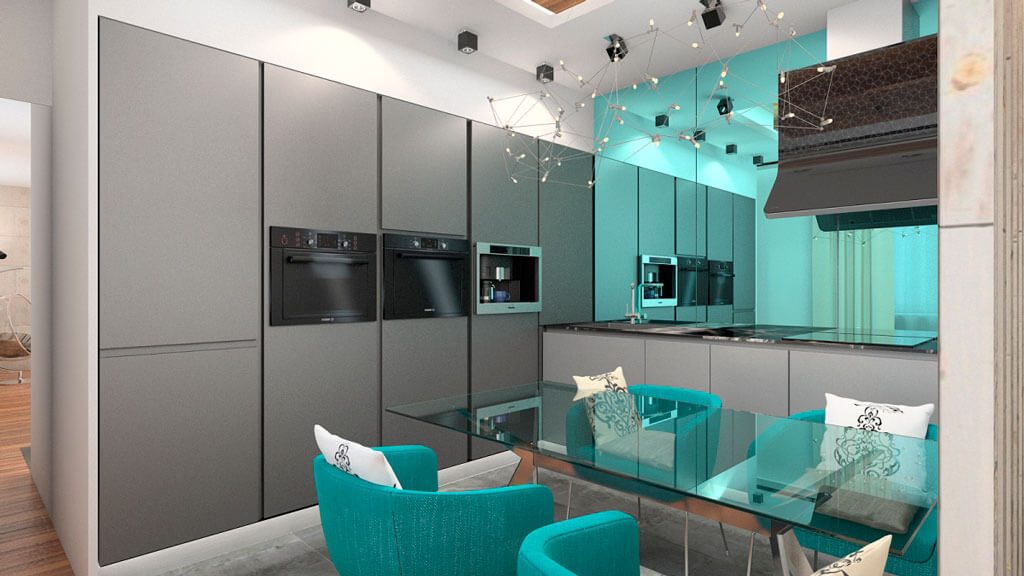 Если кухня небольшая — возможно, стоит объединить ее с балконом или гостиной, а с помощью освещения разделить на рабочую и обеденную зоны.