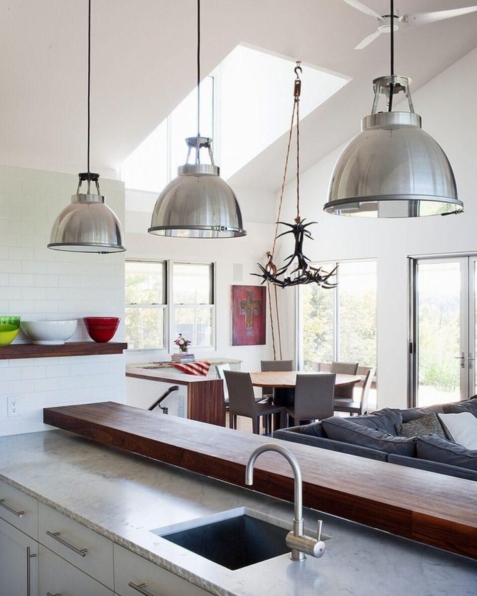 Модели из дерева по африканским, этническим и восточным мотивам добавляют помещению уюта. Их можно выбрать для кухни, совмещенной с гостиной, разместив несколько ламп над обеденным столом или островом.