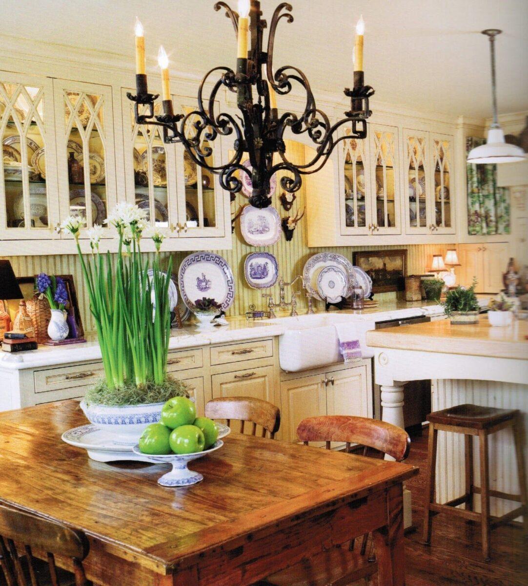 На фото кухня-столовая в стиле кантри с кованой подвесной люстрой над обеденной зоной.