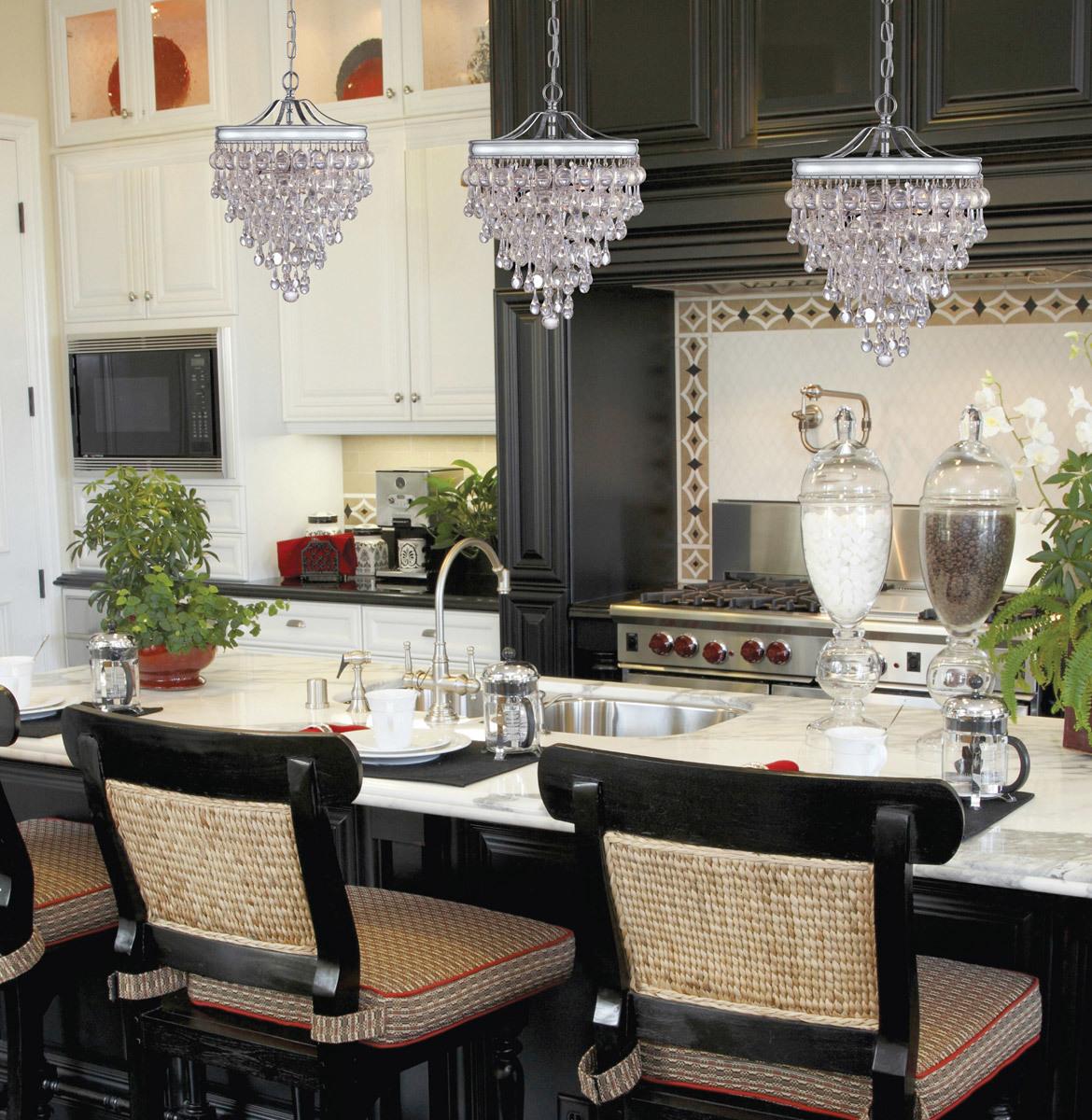 Для длинной кухни подойдет люстра вытянутой формы. Она крепится на несколько подвесов, а все лампочки находятся на одной линии. Если люстра является единственным источником света на вашей кухне, такой вариант не только красиво впишется в стиль комнаты, но и отлично осветит ее.