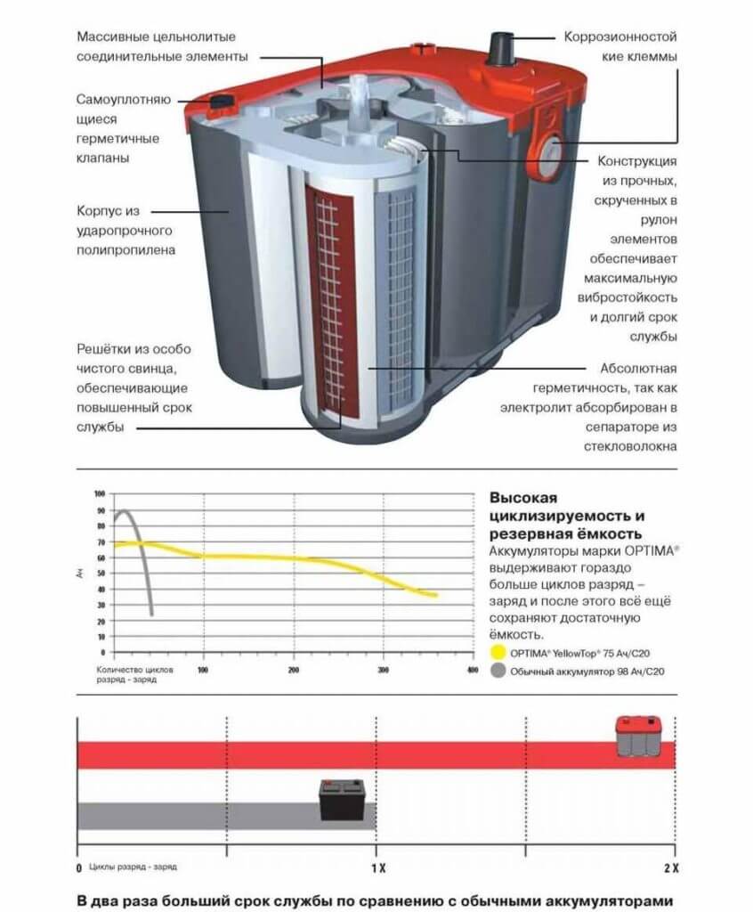 Во многом, принцип их работы похож на свинцово-кислотные модели. Однако в этой группе есть несколько особенностей, выгодно отличающих такой тип АКБ. Электролит в этих аппаратах находится не в жидком состоянии, что позволяет выдерживать даже глубокую разрядку. При разрядке электролит не испаряется, как происходит в свинцово-кислотных аккумуляторах. АКБ группы AGM очень неприхотливы, и отличаются повышенной безопасностью. Если вам нужен лучший аккумулятор для зимы, то ищите его среди моделей этой категории.