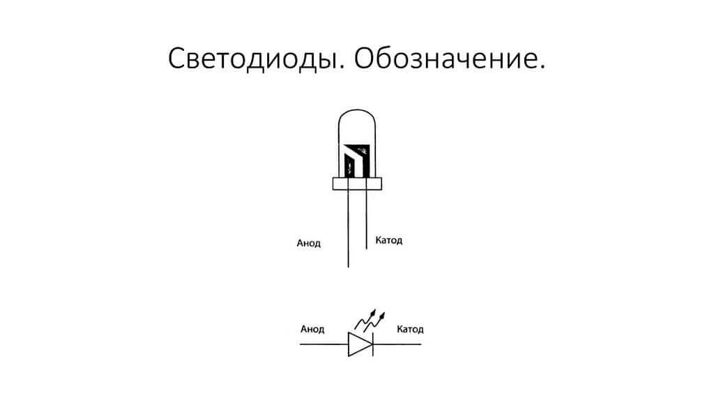 У некоторых светодиодов может быть метка, указывающая на полярность. Это точка, кольцевая полоса, которая смещена к плюсу. У старых образцов есть заостренная с одной стороны форма, соответствующая положительному электроду.