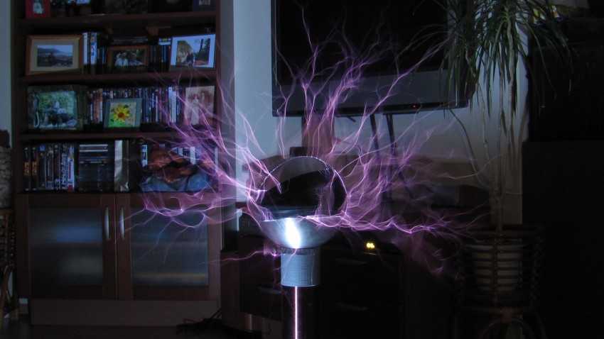 Частично переданная энергия преобразуется в напряжение. Причем есть закономерная взаимосвязь между этой величиной и временем, за которое образуется колебательный контур. Показатели прямо пропорциональны. Наличие двух колебательных контуров и является принципиальным отличием катушки Тесла от простого трансформатора. Причем результат работы первой заключается в появлении видимых стримеров – разрядов молнии искусственного происхождения. В результате происходит ионизация водорода, содержащегося в воздухе, как и во время сильной грозы.