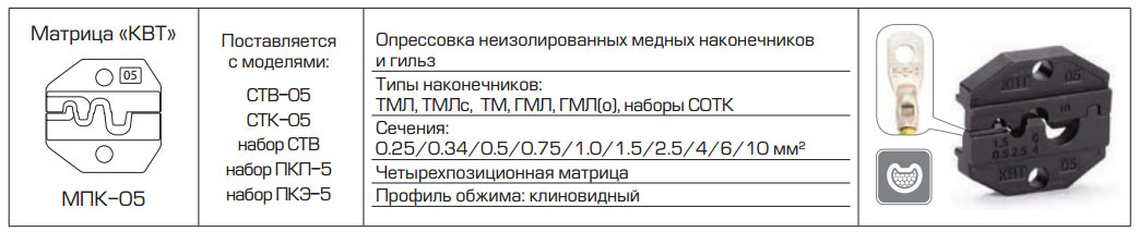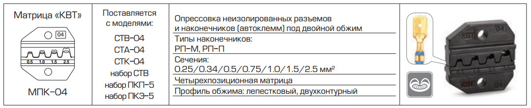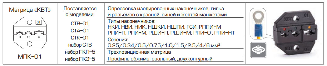 Еще в набор входит матрица МПК-01 для изолированных коннекторов марки НКИ, НВИ и им подобных. Она рассчитана на сечения от 0,5 до 6мм2.