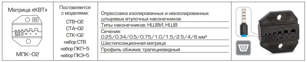 Для опрессовки двойных втулочных наконечников марки НШВИ-2 нужно воспользоваться матрицей МПК-06. Она имеет 7 позиций и обжимает наконечники от 0,5 до 6мм2.