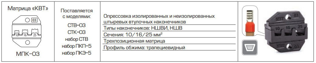 А что делать если у вас втулочный наконечник сечением целых 25мм2? Здесь вас выручит матрица модели МПК-03. Эта матрица уже обжимает втулочные изолированные и неизолированные наконечники от 10 до 25мм2.