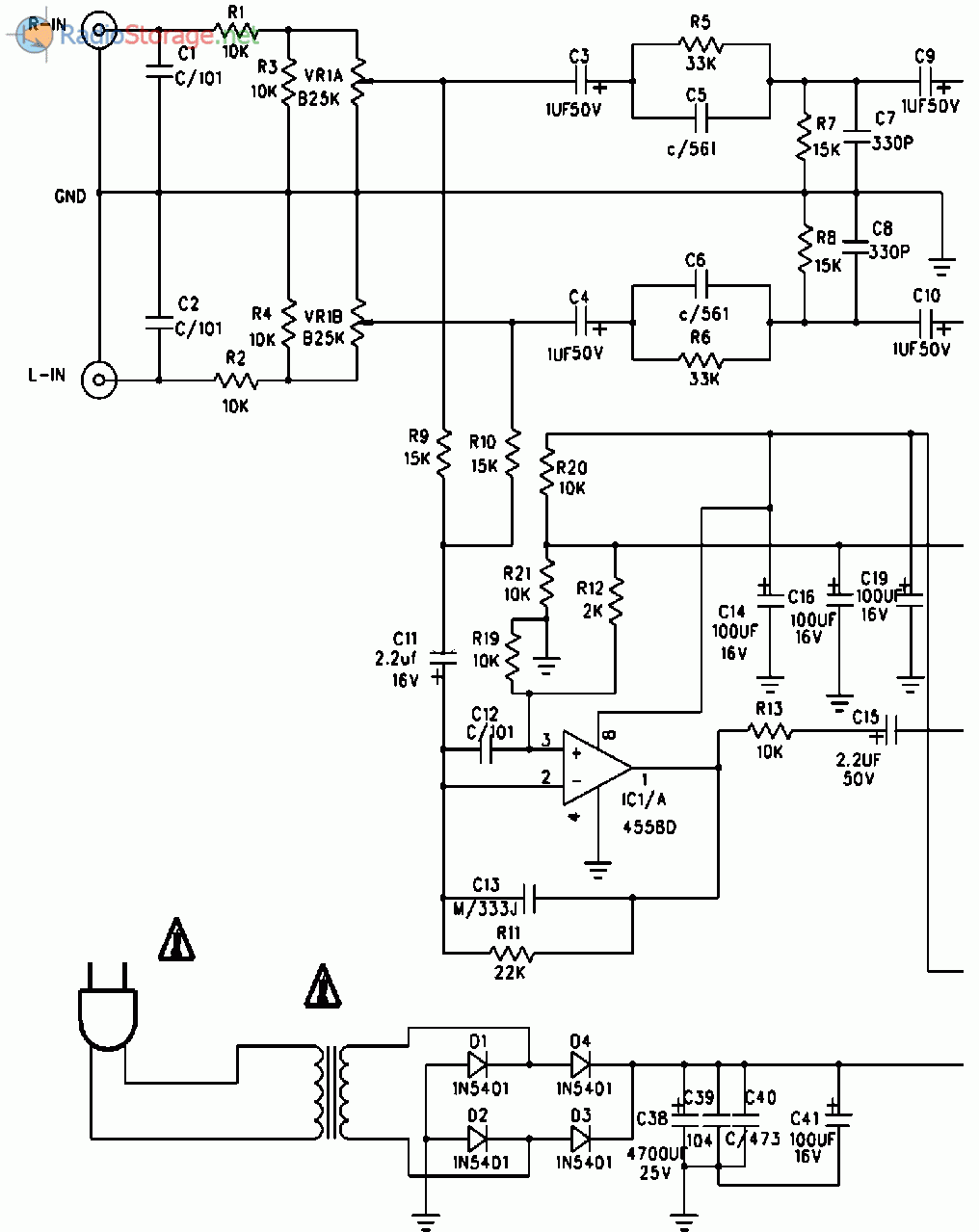 Испытывающим затруднения, читая иностранные чертежи, поясняем, схема изображает полосовой фильтр Narrow отброшен : Емкость 4 мкФ. Подробнее здесь.