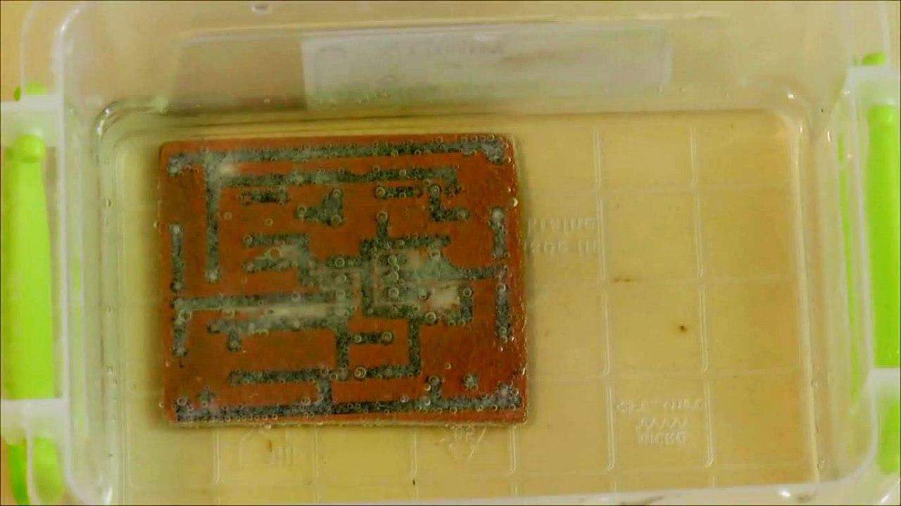 Готовый реактив наливаем в пластиковый контейнер и аккуратно опускаем заготовку платы.