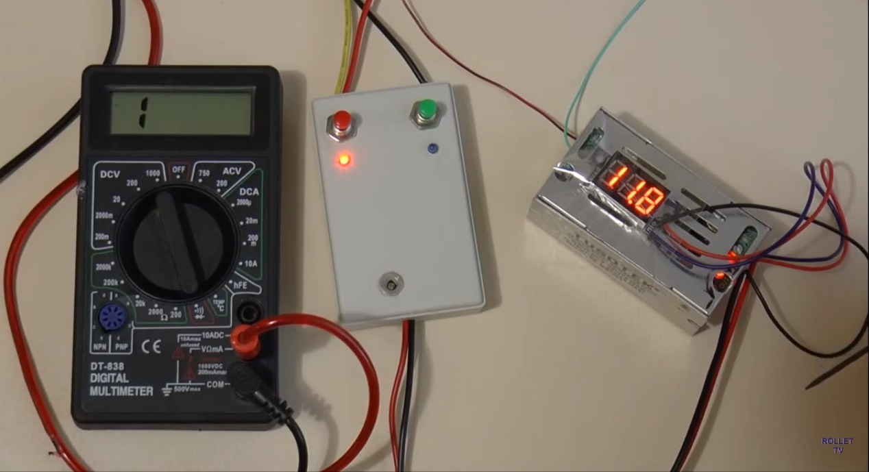 Как только напряжение упадёт ниже выставленного предела, то включается зарядка. На контроллере заряда загорается красный светодиод, а на табло мультиметра меняется индикация.