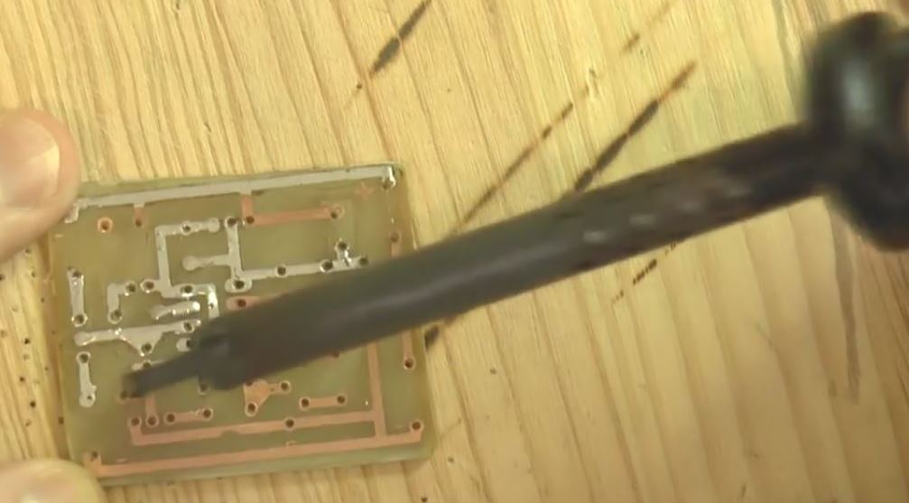 Спирто-канифольным флюсом покрывают всю поверхность платы, а затем тонким слоем наносят припой на медные дорожки.