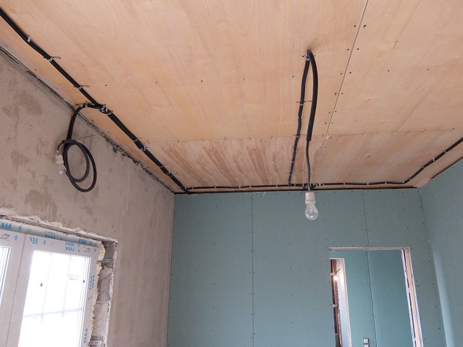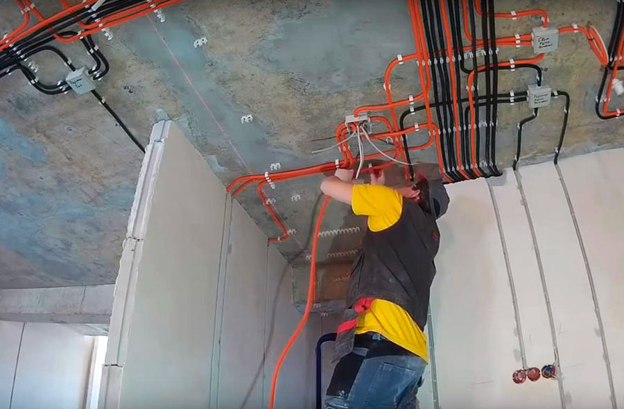 В настоящее время перекрытия подготавливаются при стройке. Заранее прокладываются электротехнические трубки из пластика, закладываются установочные и проходные коробки в будущий потолок. Далее происходит заливка перекрытий. Однако это характерно для современных образцов, но не для старых домов.