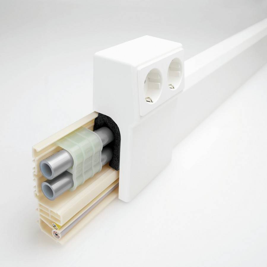 На строительных рынках можно найти плинтусы с каналами большого сечения. В них прокладывают жгуты проводов, распределяя их внутри помещения. Такой способ прокладки электросети удобен для размещения проводов телевидения или домашнего интернета.