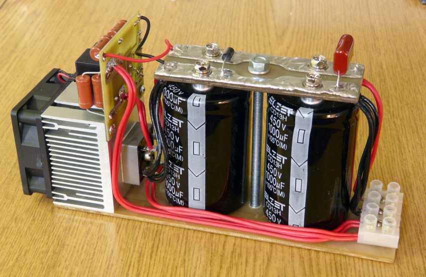 Хотя можно было собрать схему блока питания самому. Ни с кем не советовался и сам начал собирать. Собрал набор конденсаторов с реле, диодный мост с полевыми транзисторами. Установил вентилятор охлаждения на случай, если будет двигатель нагрузки 4 кВт, и будет нагреваться. При двигателях 2-3 кВт преобразователь работает нормально, никаких проблем с нагревом нет. Я решил сделать так, чтобы вентилятор не работал постоянно, так как он будет засасывать в шкаф пыль, потом его надо будет чистить. Решил сделать так, чтобы кулер включался и выключался при определенных температурах.
