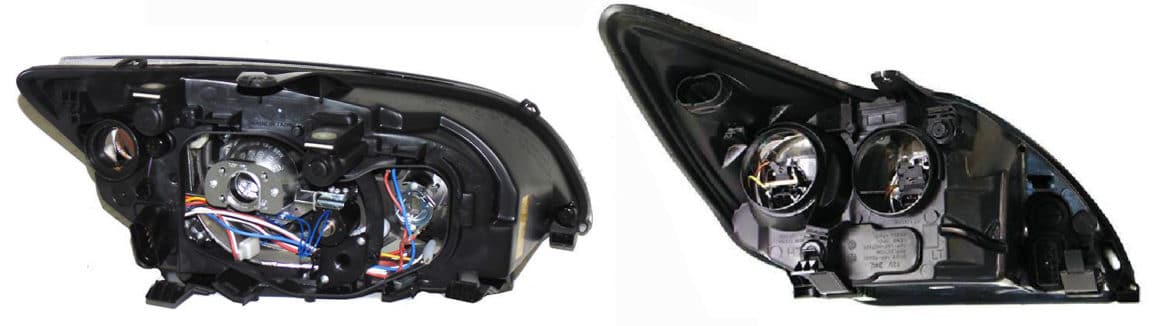 Тыльная часть блок-фары Форд Фокус до (слева) и после рестайлинга (крышка и пыльники сняты)