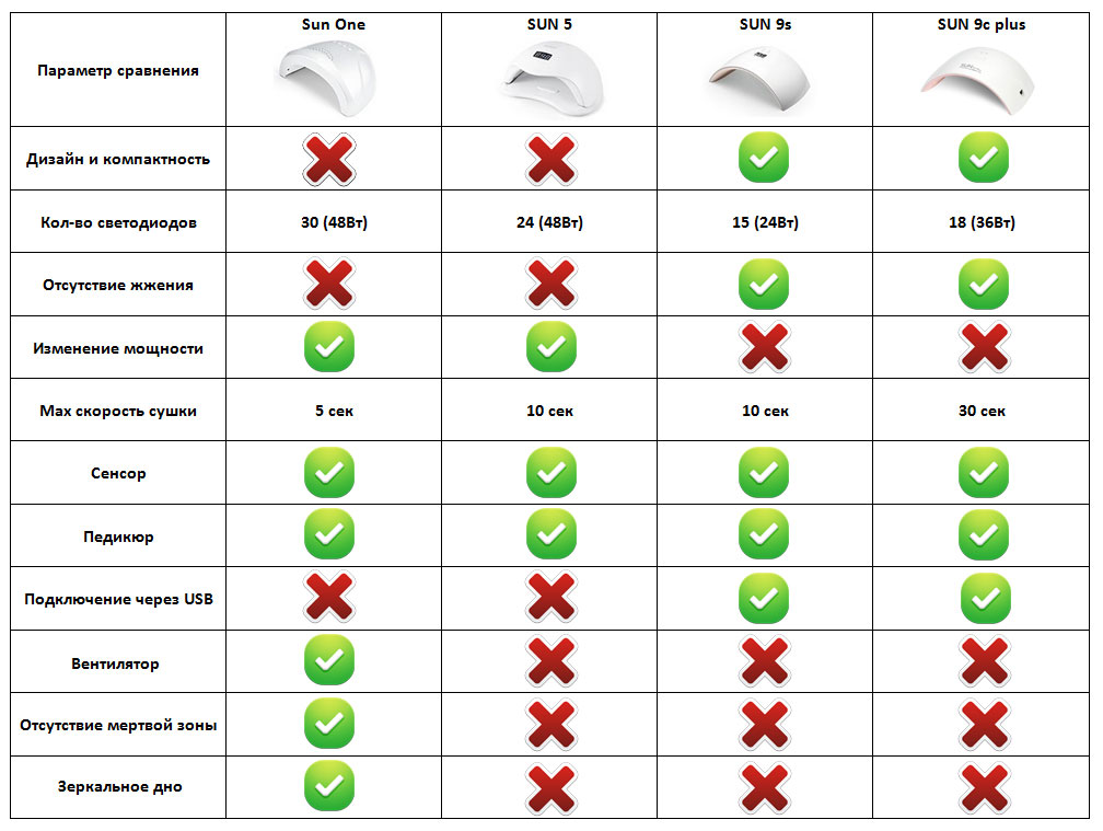 Вот для вашего удобства сравнительная таблица характеристик, достоинств и недостатков наиболее популярных ламп для маникюра выпускаемых под маркой SUN.