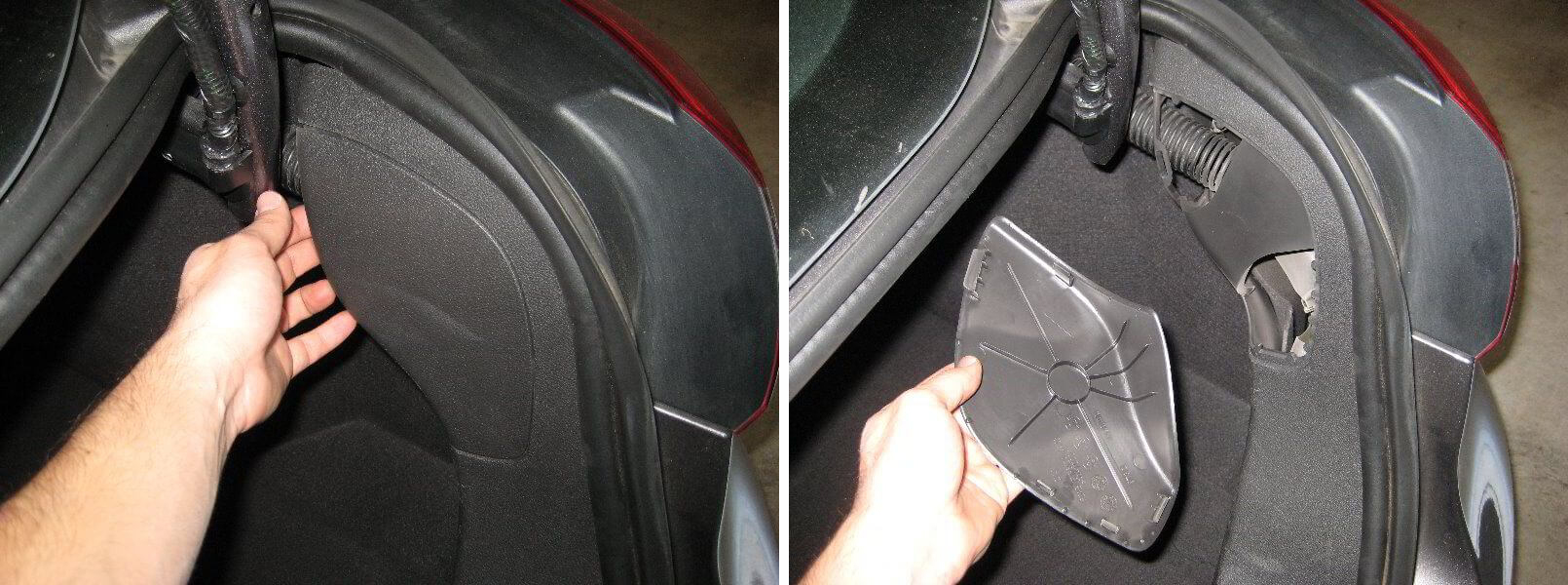 Открываем дверь багажника и напротив фары находим лючок, закрытый крышкой. Поддеваем крышку пальцами и снимаем.