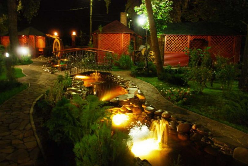 Начнем с фонтана – вот уж где природа и техника объединились в одно целое. Как уже было описано выше: самый доступный метод освещения фонтана – это светодиодная подсветка. Стоит напомнить об электробезопасности, и, если электротехника – не Ваш конек, то лучше попросить помощи специалистов. Но основные правила – это водонепроницаемый кабель, герметичный корпус светильника и герметичность ввода кабеля. Специалисты советуют использовать оптоволоконные световоды – они не нагреваются, пожаробезопасны, абсолютно герметичны. Для бассейнов и поверхностей пруда используют плавучие светильники. И если водоемом не пользуются, то энергию плавающие светильники могут получать через кабель. Плафон светильника может иметь матовую поверхность и излучать мягкое свечение. Представьте себе светящийся шар в вашем бассейне – это так загадочно.