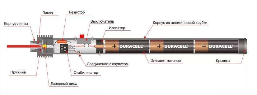 Базовый элемент любого прибора, в название которого входит слово «лазерный», это излучатель узконаправленного монохроматического (одноцветного) излучения. В основе явления – принудительное излучение, которое, в зависимости от мощности, воспринимается по-разному. Маломощные лазерные излучатели на основе красных, красно-оранжевых, желто-оранжевых и зеленых диодов позволяют получить точку или луч света. При высоком уровне накачиваемой энергии луч лазера способен превратиться в оружие – он может поджечь хорошо поглощающие излучение материалы.