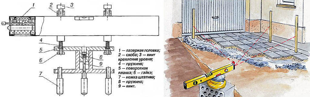 - Прибор самовыравнивающего характера — нивелир, в который входит специальный маятник, который может излучать около пяти лучей. На таком прибор может также быть прицел крестообразного типа.