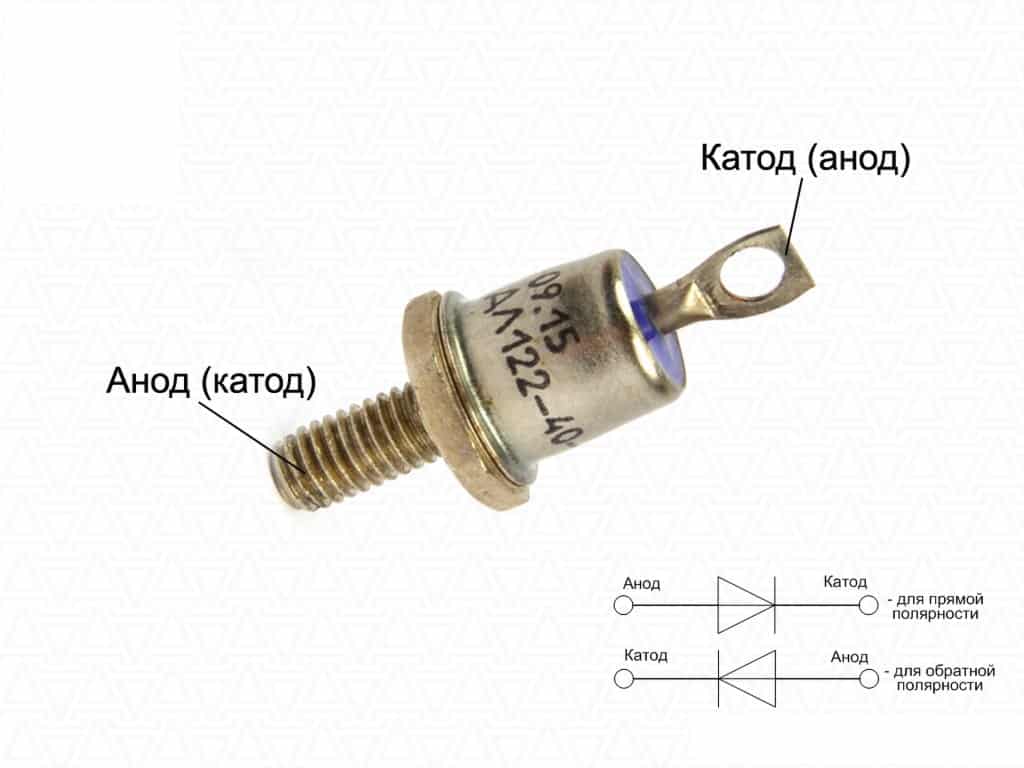 На рисунке показано условное обозначение диода на схеме. Буквами А и К соответственно обозначены анод диода и катод диода. Анод диода – это вывод, который подключается к положительному выводу , непосредственно или через элементы схемы. Катод диода – это вывод из которого выходит ток положительного потенциала и далее через элементы схемы попадает на отрицательный электрод источника тока. Т.е. ток через диод идёт от анода к катоду. А в обратном направлении диод ток не пропускает. Если каким-то из своих выводов диод подключается к , то на другом его выводе получается постоянное напряжение с полярностью, зависящей от того, как диод подключен. Если он подключен анодом к переменному напряжению, то с катода мы получим положительное напряжение. Если он подключен катодом, то с анода будет получено соответственно отрицательное напряжение.