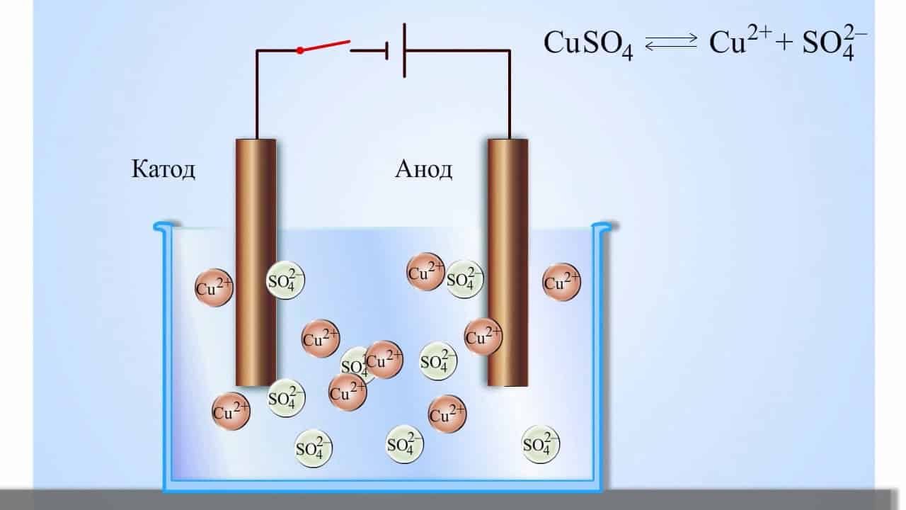 На рис. 1, изображено процесс электролиза, при котором происходит перемещение анионов (отрицательных ионов) и катионов (положительных ионов). Анионы устремляются к аноду, а положительные катионы – в сторону катода.