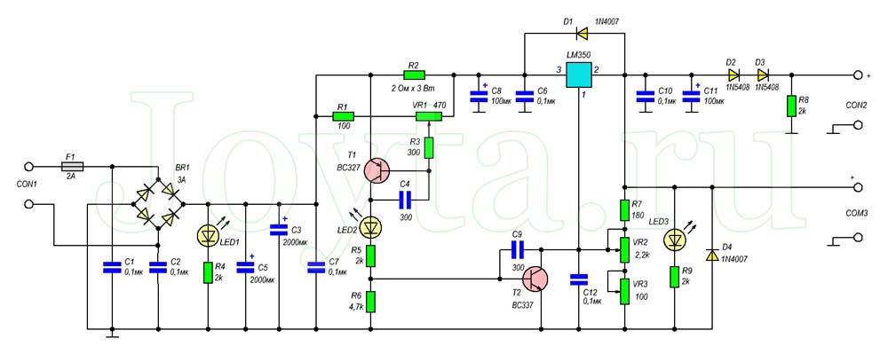 Принципиальная схема блока питания приведена на рисунке ниже. Источник питания построен с использованием мостового выпрямителя (BR1), регулируемого стабилизатора напряжения LM350 (IC1), транзисторов BC327(T1) и BC337(T2) и нескольких дополнительных компонентов.