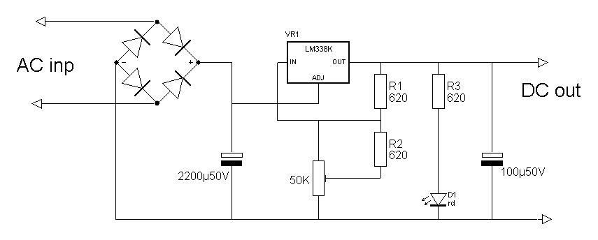 Переменный резистор R1 используется для плавного регулирования выходного напряжения. Например, диодный мост из четырех выпрямительных диодов Д обеспечит рабочие токи до 10А.