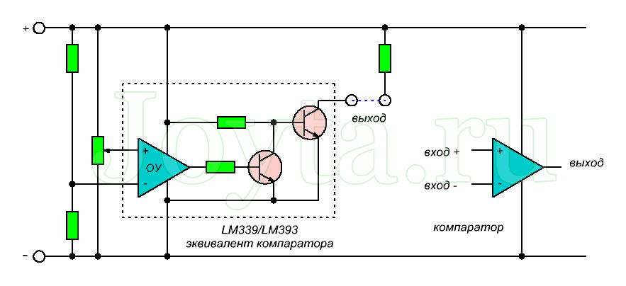 Выход включается или выключается в зависимости от относительных напряжений на плюсовом (+) и минусовом (-) входах компаратора. Входы компаратора крайне чувствительны и разница напряжения между ними всего лишь в несколько милливольт приводит к переключению его выхода.