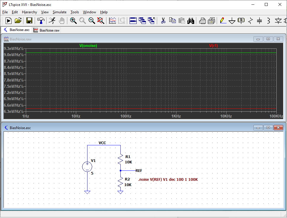 Теперь добавим конденсатор для фильтрации шума от источника питания. Этот конденсатор также фильтрует шум от R1 и R2. Запустите ту же симуляцию снова. Шум на низких частотах не изменился, но на высоких частотах шум отфильтровывается. Резисторы и конденсатор образуют фильтр нижних частот.