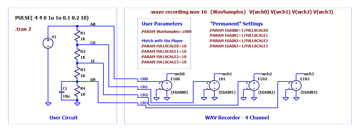 Источники напряжения, управляемые напряжением (E100 и т.д.), выполняют две функции. Во-первых, они изолируют имя узла в пользовательской схеме (User Circuit) от имен узлов в директиве . Узел в пользовательской схеме подключается к входу регистратора без необходимости беспокоиться об именах узлов. Во-вторых, источники E обеспечивают масштабирование для входов, поскольку функция имеет фиксированный размер шкалы. Операторы в списке User Parameters (пользовательские параметры) модифицируются для независимой настройки размера шкалы для каждого канала. Еще один пользовательский параметр, – это количество выборок в секунду. Имя файла я указал непосредственно в директиве .