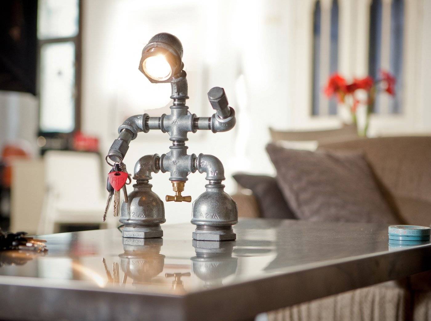 Нефункционирующие водопроводные трубы с кранами можно смонтировать в единую конструкцию, оборудовать лампочками и создать, таким образом, стильную и полезную вещь. Ее лучше размещать на стене. Это очень популярный элемент отделки в стиле лофт. Из больших и маленьких труб создаются светильники в стилистике стимпанк. Это сложные конструкции, без специальной подготовки сделать их не получится. Однако можно сконструировать небольшого робота с «головой» в виде лампочки. Из труб делаются красивые потолочные люстры. Помимо этого, существуют разнообразные модели светильников из металлических труб. В качестве материала часто используется латунь. Люстры создаются в виде композиций из нескольких трубок. Трубы, как правило, делают цельными, но производят и светильники с различными узорами и проемами. Они не уступают в популярности светильникам в стилистке лофт.
