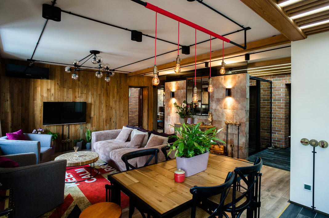 В атмосфере старинного производственного помещения шарм создаст простая и добротная грубость. Шинные варианты светильников следует располагать именно под потолком. Смотрится такое оформление просто великолепно.