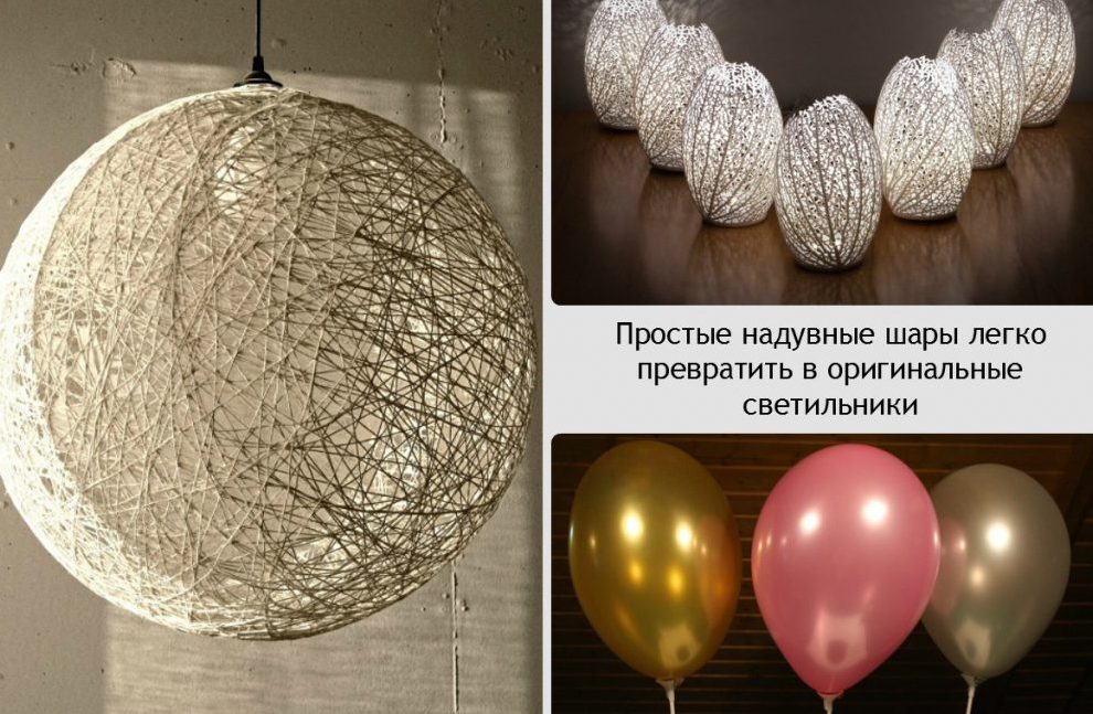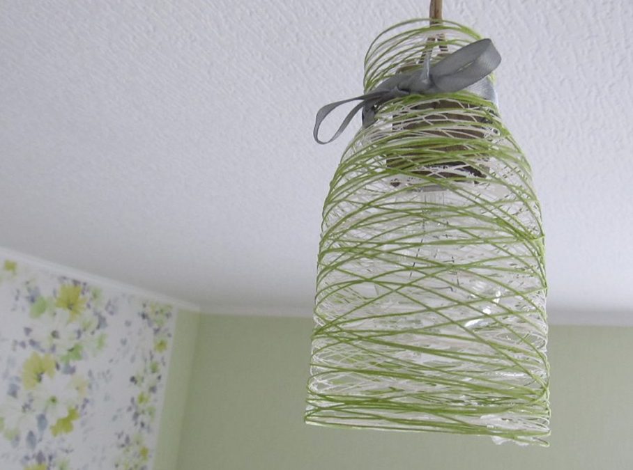 Распространены потолочные светильники из пряжи, которой обматывают воздушные шарики, а потом всю конструкцию покрывают клеем. Для многих такой простой вариант — первая проба в этом виде рукоделия. Эффектнее смотрятся люстры из коряги, бутылок или подвесные конструкции из пластиковых труб.