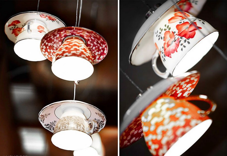 Чайные чашки. Старый вышедший из моды сервиз способен превратить обычный каркас люстры в шедевр. Чайник располагается в центре самой люстры, а чашки с блюдцами – по краям. В зависимости от конструкции каркаса, чашки можно разместить донышком кверху или книзу.