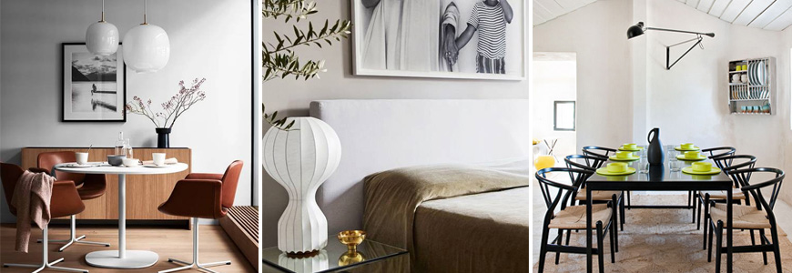 В интерьерах скандинавского стиля на фоне спокойных белых оттенков стен представлены картины в виде контрастных элементов или столовая группа. Часто применяются итальянские светильники пастельных тонов такие, как Cocoon Gatto на зеркальном столике или наоборот контрастные цвета — настенный светильник 265 (FLOS).
