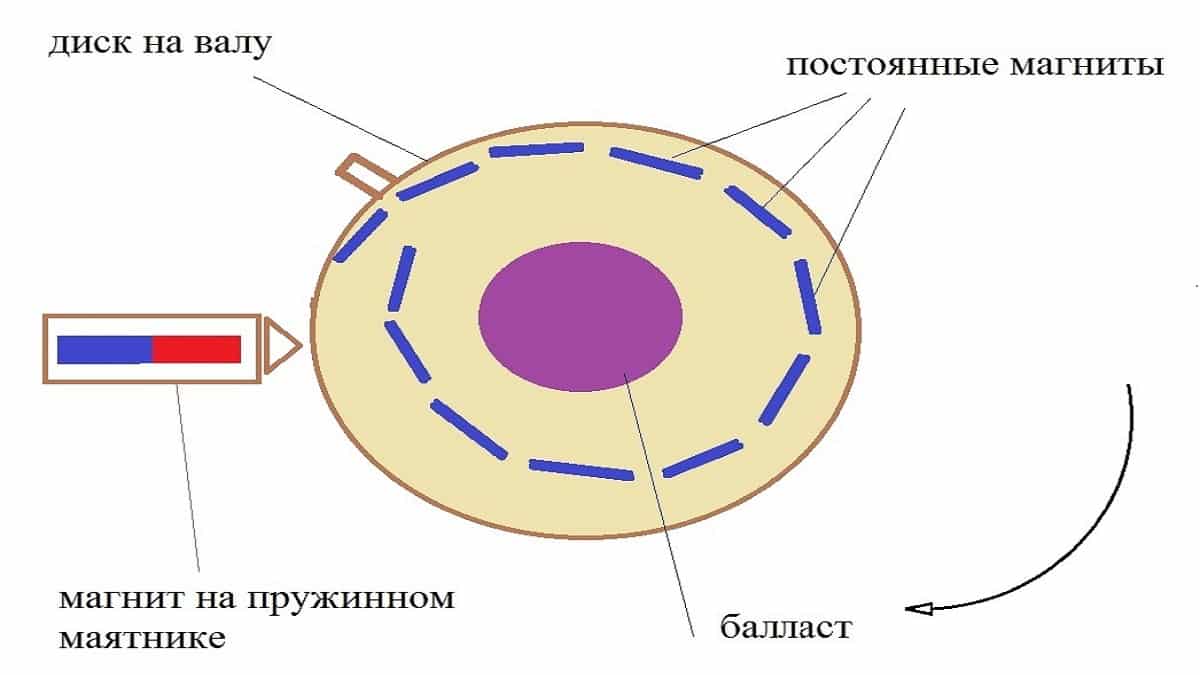 Все, что нужно для работы такого агрегата — это придвинуть магнит статора на достаточное расстояние к ротору в точке самого наибольшего удаления, как показано на рисунке. После этого магниты начнут притягиваться по мере приближения формы улитки по кругу, и начнется вращение ротора. Чем меньше размер магнитов и чем более плавная форма получится, тем легче произойдет движение. В месте максимального сближения на диске установлена «собачка», которая сместит маятник от нормального положения, чтобы магниты не притянулись в статическое положение.