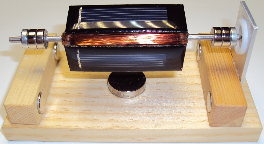 Когда свет спадает на одну из солнечных панелей, она создаёт электрический ток, который идёт по одной части ротора. Этот ток создаёт магнитное поле, которое работает с полем магнита под нашим ротором. Это взаимодействие вводит ротор в рабочее состояние. При вращении ротора новая её батарея переходит к свету и возбуждает ток во второй обмотке. Процесс повторяется до того момента, пока на батарею попадают солнечные лучи.