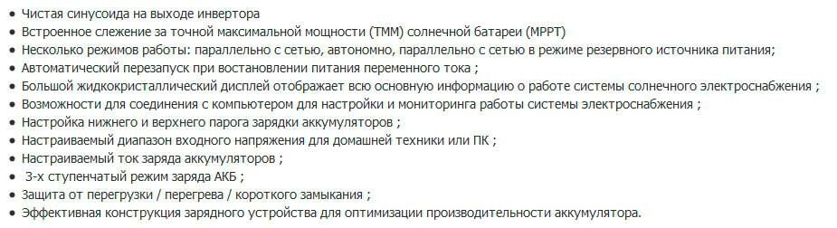 - Возможность подключения сетевого фотоэлектрического инвертора к выходу устройства;