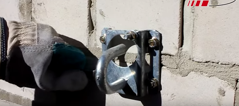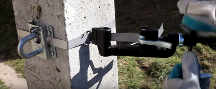 4. С помощью бандажной ленты и специального инструмента закрепляем крюк на опоре (столбе).