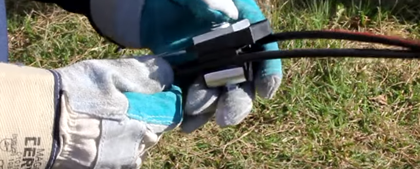 5. Устанавливаем натяжной зажим, одеваем его на крюк опоры и отмечаем место присоединения к магистральному проводу.