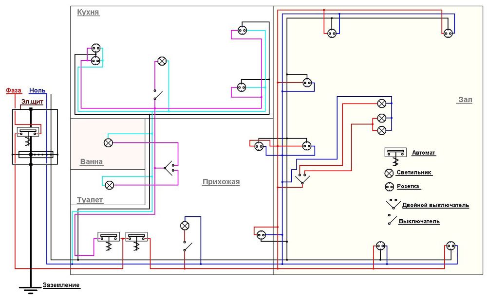 Эту разновидность электрических схем мы чаще всего используем на сайте, когда рассказываем о том, как самостоятельно выполнить монтаж электропроводки. Дело в том, что на монтажной электросхеме можно показать точное расположение всех элементов цепи, способ их соединения, а также буквенно-цифровые характеристики составляющих чертеж установок. Если взять за пример схему электропроводки в однокомнатной квартире, на ней мы увидим, где нужно размещать розетки, выключатели, светильники и остальные изделия.