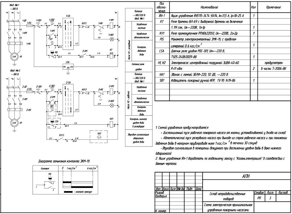 Такие чертежи отличаются максимальной информативностью, так как содержат описание всех элементов и электрических цепей. В этом примере приведена пояснительная записка, содержащая сведения о рабочем алгоритме и особенностях конкретного проекта. В таблицу занесены данные о марках насосов, особенностях иных компонентов. С помощью диаграммы уточнена функциональность контактной группы.