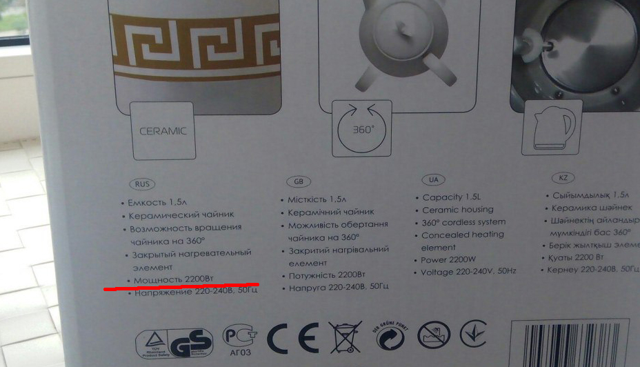 - Узнать мощность чайника. Она указана на коробке или в инструкции. Если нет ни того, ни другого, то можно посмотреть в интернете.