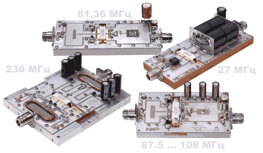 - 87.5 … 108 МГц:Очень большая выходная мощность MRF1K50H позволит сократить число транзисторов и усилительных модулей, необходимых для получения требуемой мощности на входах антенн передатчиков УКВ и цифрового радио. Эта широкополосная оценочная плата адресована разработчикам именно таких систем.