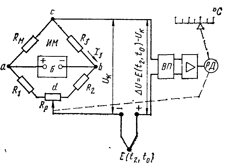 иd возникает разность потенциалов, а через прибор, включенный в диагональbd, протекает ток. Причем, чем больше изменение R , тем больше этот ток. Т.е. для получения измерительной информации используется разбалансированность.